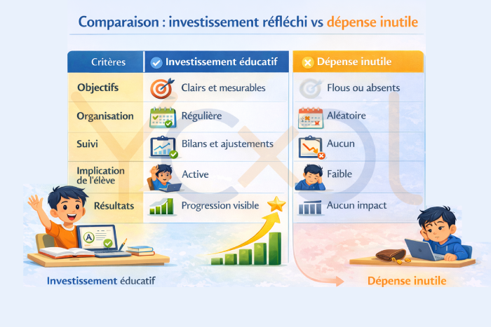 - Impact à long terme : un investissement réfléchi permet d’acquérir des méthodes de travail, de la confiance et des compétences transférables à d’autres matières, alors qu’une dépense inutile n’a aucun effet durable sur les apprentissages.